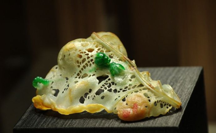 这是一块原本10公斤重的老坑种翡翠原石,硬是被雕琢成了一片片悬空的兰叶。坚硬的翡翠化成了柔软的线条,什么叫做不惜工本哪!
