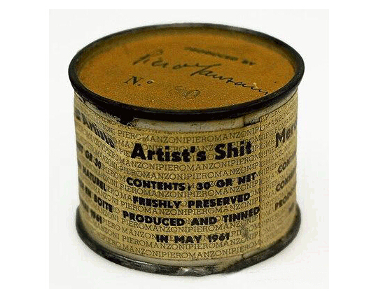 1961年,意大利艺术家皮耶罗•曼佐尼(PieroManzoni)制作了他最著名的作品《艺术家的大便》——他把自己的粪便装进90个密封的罐头里,每个大便罐头都有独一无二的编号以及曼佐尼的签名;每罐净重30克的大便,定价为37美元(按当时汇率,约91.1元人民币)——这跟当时黄金定价一致。如今,这些大便罐头价格超出了黄金价格的百倍,2005年,编号57号的“艺术家的大便”罐头成功拍卖了11万欧元,约合人民币120万;2007年, 编号18号的“艺术家的大便”罐头,在意大利米兰的苏富比拍卖会上,拍卖了12万欧元,大概是当时的人民币150万……