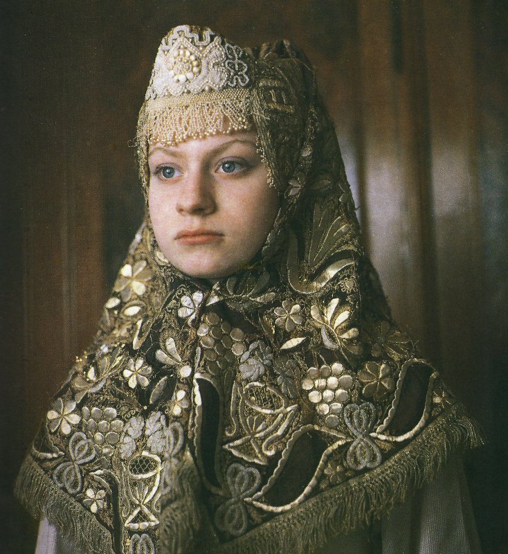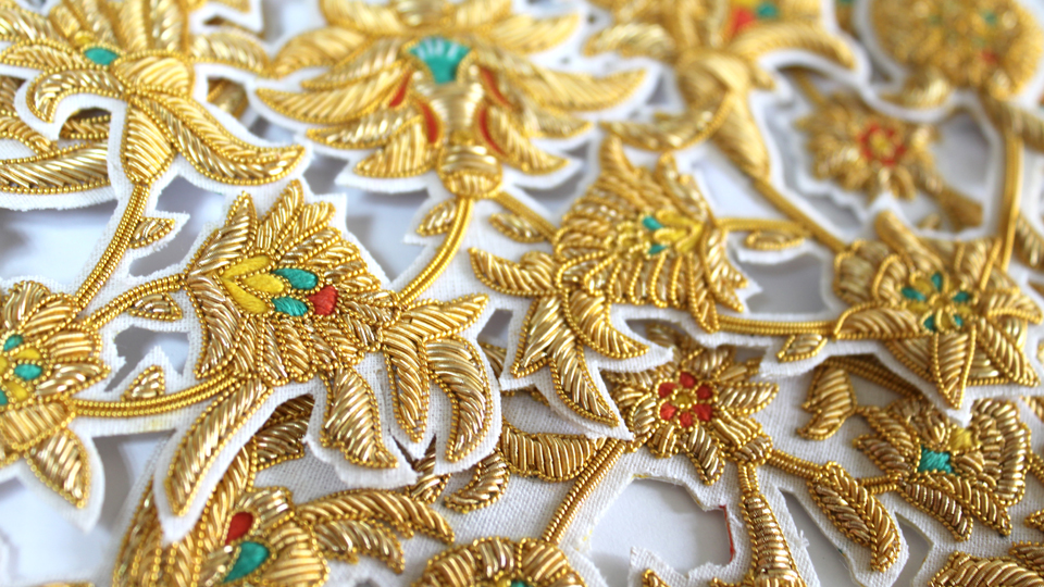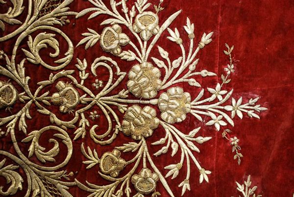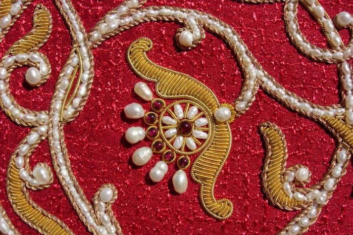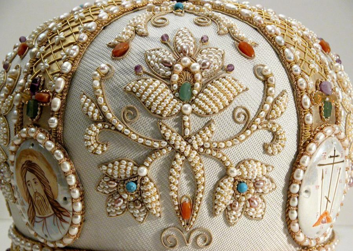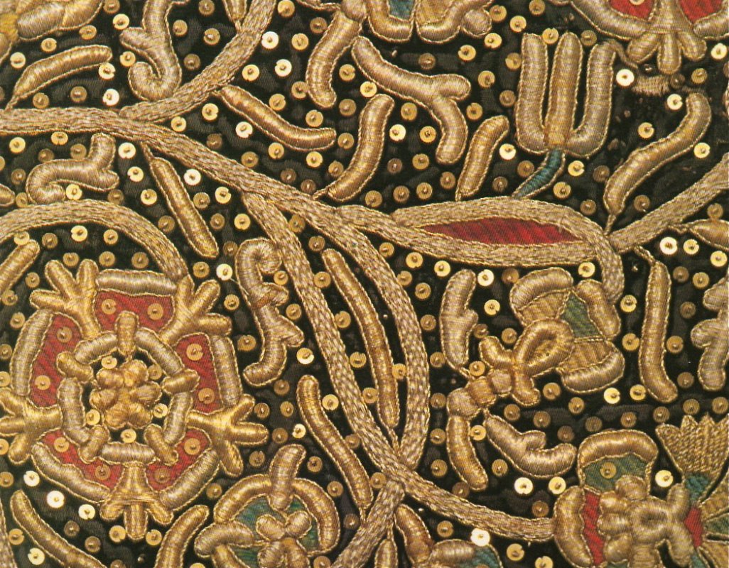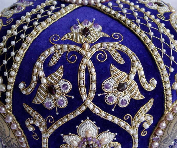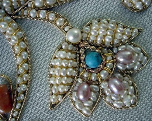 俄金线绣和中国的金线绣都常应用于图案的外围轮廓上,但与中国金线绣以单色平绣填充内部图案不同,俄罗斯民族喜以珍珠填满轮廓内部,这种富丽堂皇的拜占庭刺绣艺术效果过去常见于皇族和神职人员的礼服上,直到1917年的俄国革命后才逐渐废除。