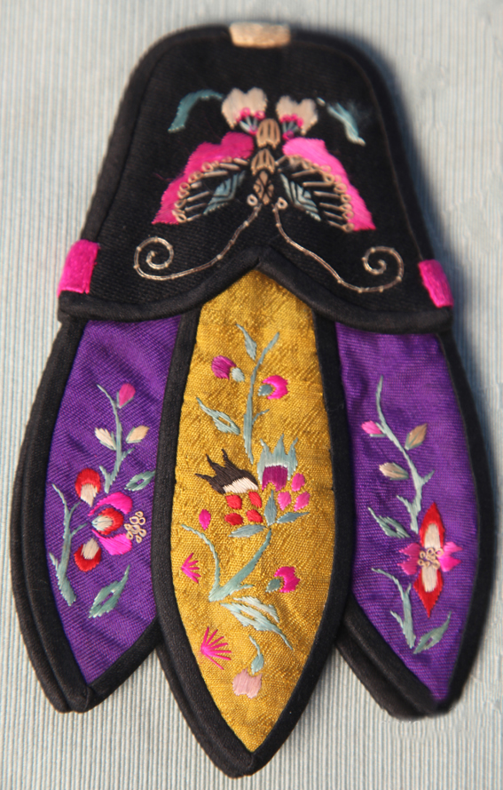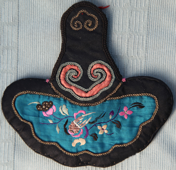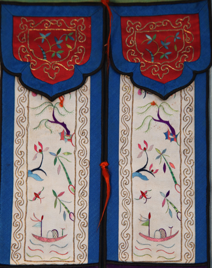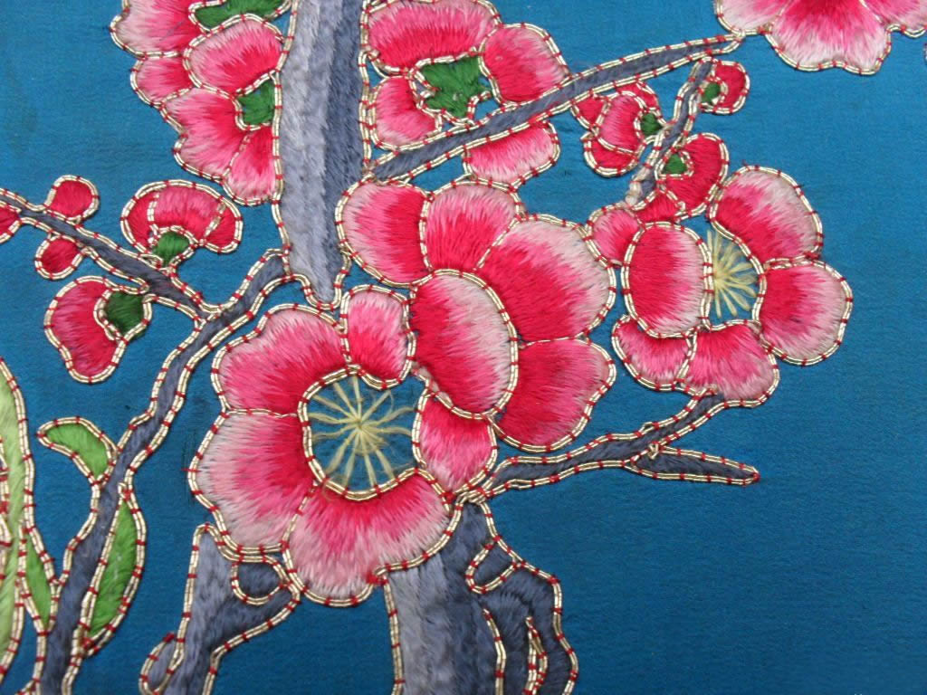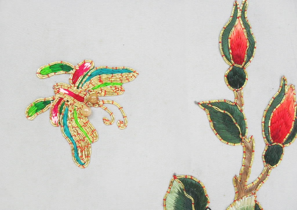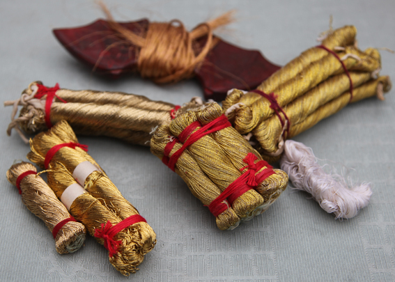 宁波金银绣采用各色真丝织品为原料,在彩绣、平绣图案周围盘绣以金、银线而成。金银线由纯金银制成的金银箔,再切成0.2毫米的片金线,这些片金线可直接用做绣线,或再由片金线制成金银细线,以棉线为芯线,将片金线旋绕于芯线的外层而成。