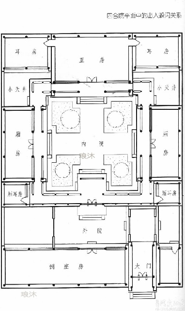 有的正房和厢房带廊子。五间的是三间正房两间耳房,耳房是单开门,所谓“三正两耳”。七间的,在正房和耳房之间,有两个与正房相通的(在山墙开门)套间儿。东西厢房各三间,厢房和耳房之间,有个过道儿,可以通后院。