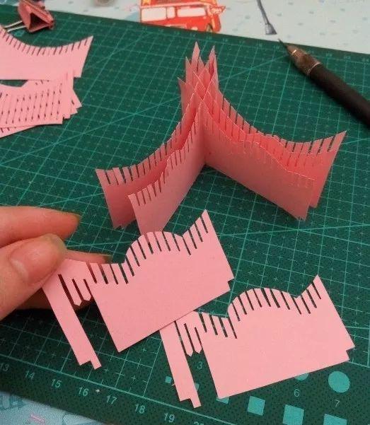将每张便利贴上的虚线对折,立在桌子上会出现不同人物的剪影,渐层的粉色便利贴纸,随着建筑物的大小也不同,真是处处惊艳。