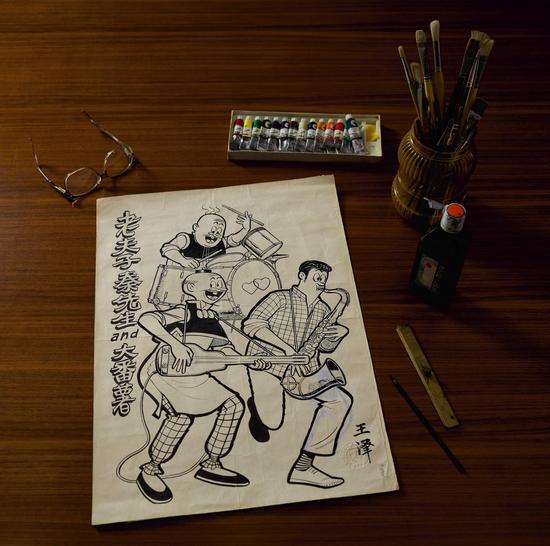王泽先生道:‘家父去世一年多以来,读者对《老夫子》始终念念不忘。今夏,为回馈也为应收藏界需 要,我很开心与多年来合作无间的苏富比再度携手,举办父亲王家禧最后一次作品公开展售。我更会把珍 藏的第二期漫画封面《摇滚老夫子》割爱,由于第一期原稿早已佚失,此乃现存最早的封面原稿,十分难 得。同时也很荣幸共同展出本人创作的压克力彩画“弦外之音”——影子系列,怀缅父亲一生的成就。