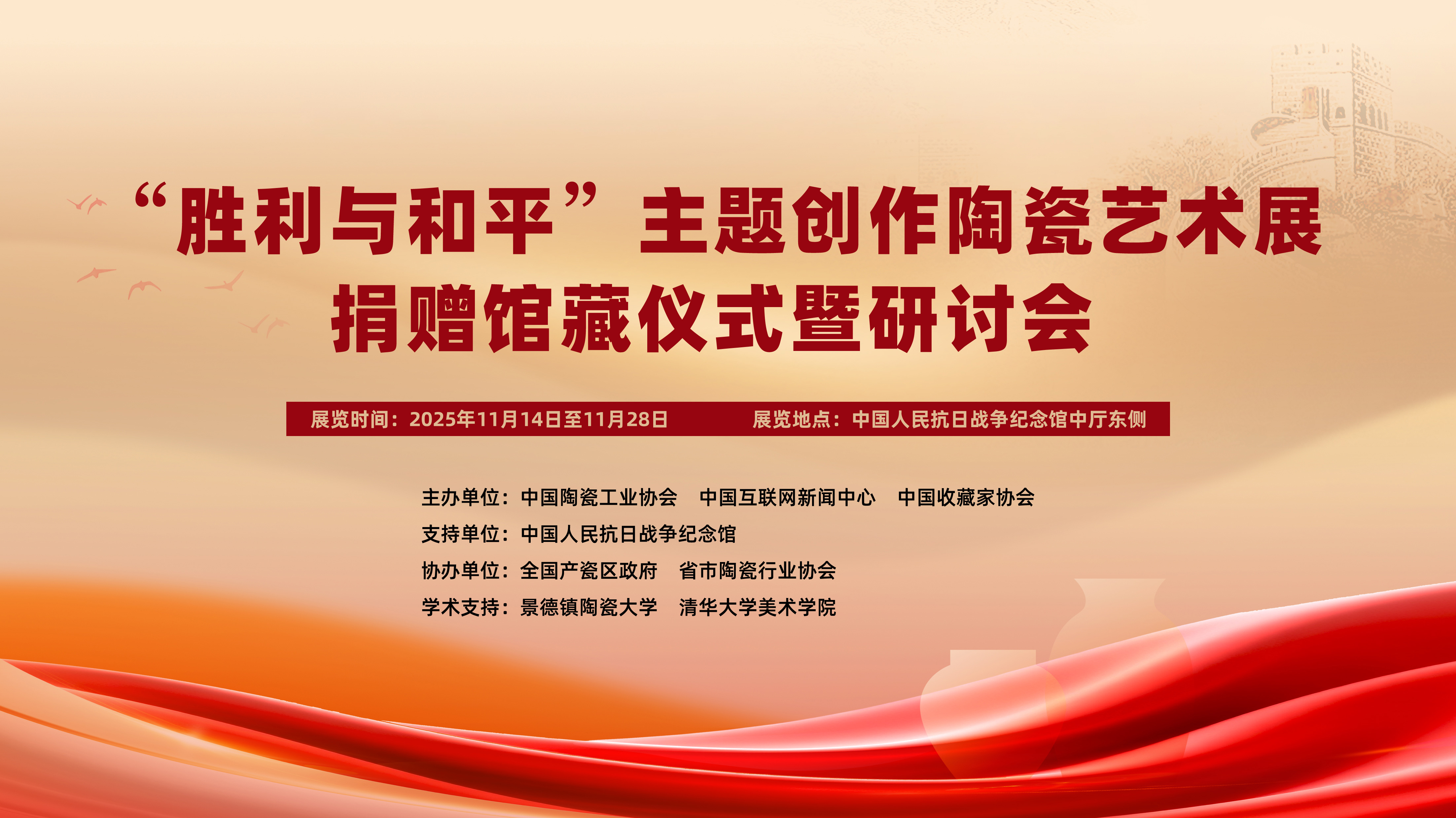 展览信息纪念中国人民抗日战争暨世界反法西斯战争胜利80周年“胜利与和平”主题创作陶瓷艺术展主办单位中国陶瓷工业协会中国互联网新闻中心中国收藏家协会支持单位中国人民抗日战争纪念馆协办单位全国产瓷区政府省